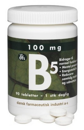 Vi har fundet Dfi B Tab fra Dansk Farmaceutisk Industri hos Helsegrossisten.dk i kategorien Sundhed B-vitamin . B5 100 mg – 90 tabletter